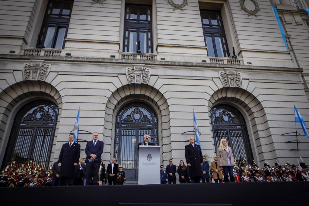 Las bandas militares y el chocolate caliente para los niños y niñas fueron las marcas distintivas de la ceremonia en la que el Mandatario les tomó la Promesa de Lealtad a la Bandera a 2.000 cursantes. En el frente del establecimiento, mirando a Casa Rosada, se colocaron banderas nacionales y pantallas gigantes de video.