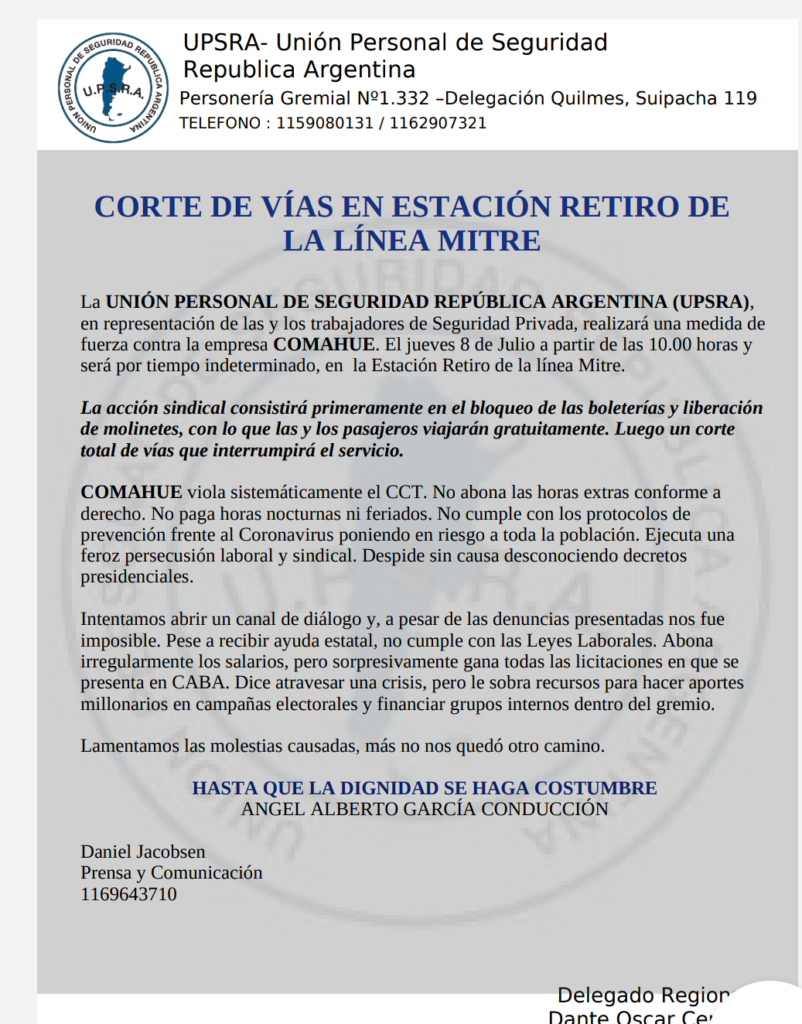 A partir de este jueves 8, desde las 10 de la mañana y por tiempo indeterminado, la Unión Personal de Seguridad de la República Argentina (UPSRA) realizará bloqueo de boleterías, liberación de molinetes, pasaje libre para los pasajeros de trenes en curso y luego corte total de vías en la estación Retiro.