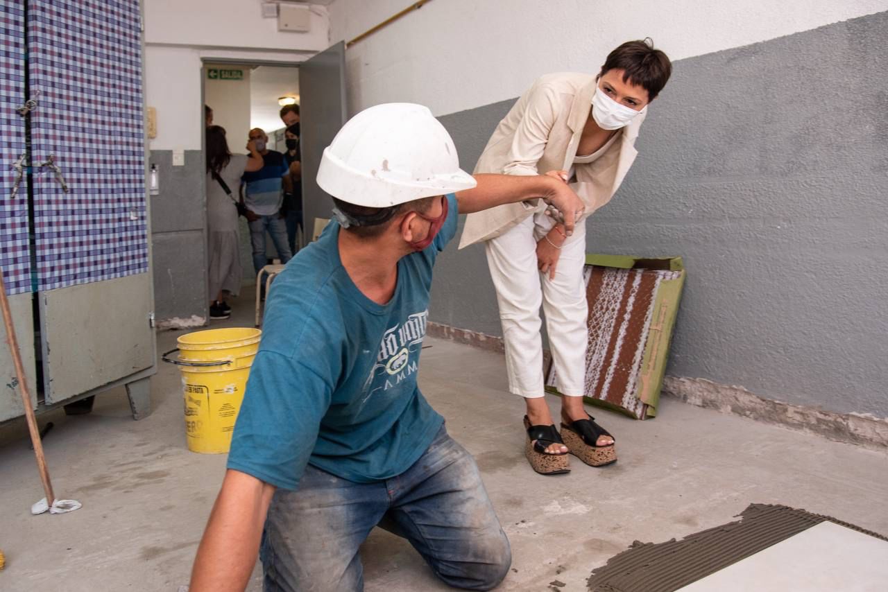 Mayra Mendoza recorrió este martes las obras de la Escuela 29 Martín Miguel de Güemes, en Brown 106 de Quilmes, donde se iniciaron trabajos de reparación de membranas, cielorrasos, cambio de pisos, colocación de rejas y adecuación eléctrica.