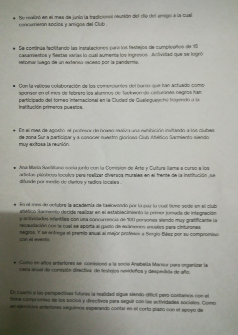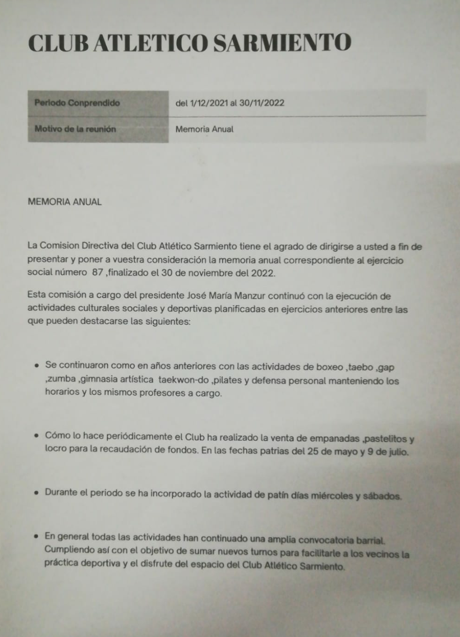 Con una treintena de socios y miembros de comisión, se realizó en el Club Atlético Sarmiento (de Sarmiento y Saavedra) la Asamblea anual en la que se hizo la rendición de Memoria y Balance y el Ejercicio Social que corresponden al año 2022.