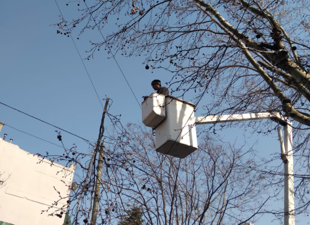 Esta mañana de jueves, el municipio realiza despuntes en árboles sobre la calle Guido, en su intersección con Lavalle. De manera accidental, engancharon con el hidroelevador un cable de energía eléctrica que dejó sin suministro a un comercio. Los responsables lo niegan, ya el comerciante hizo el reclamo a Edesur, que asegura acudir entre las 12 y las 18… Muchas horas de espera para el usuario.