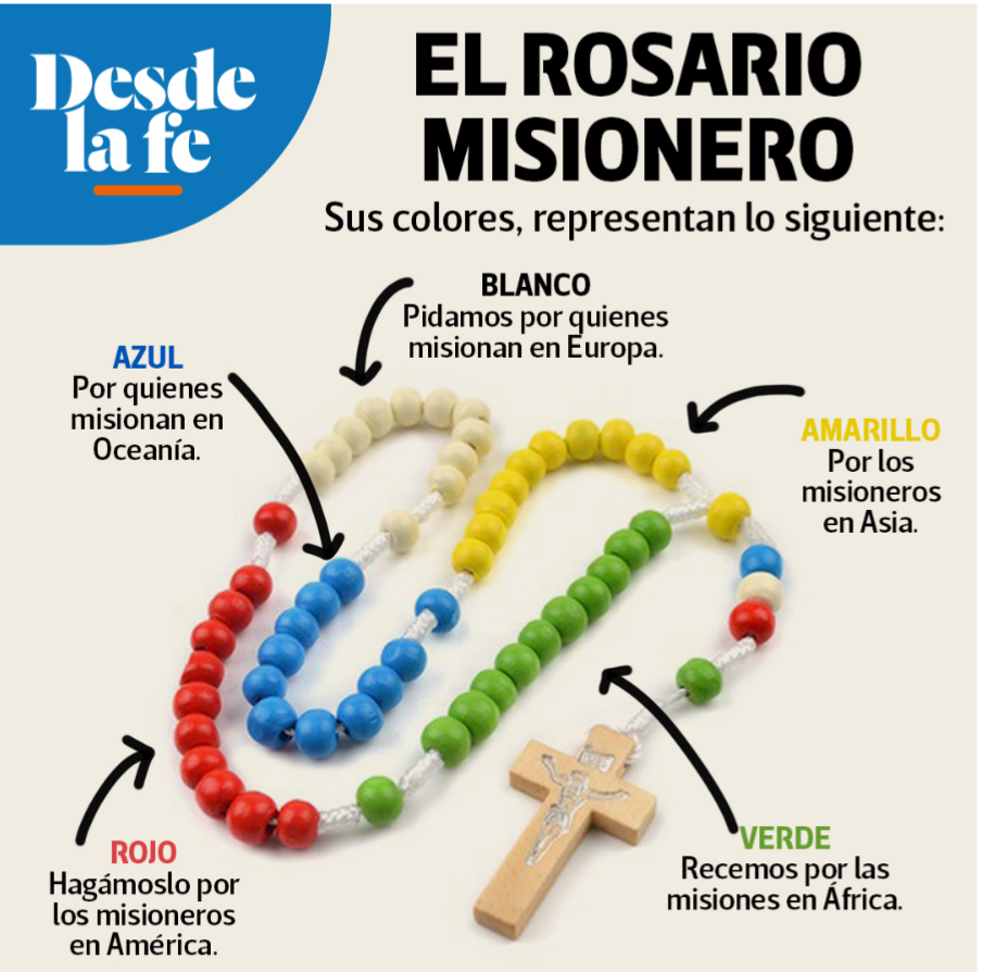 El Rosario Misionero se reza en octubre con la finalidad de poner en manos de la Virgen María la evangelización en los cinco continentes.
