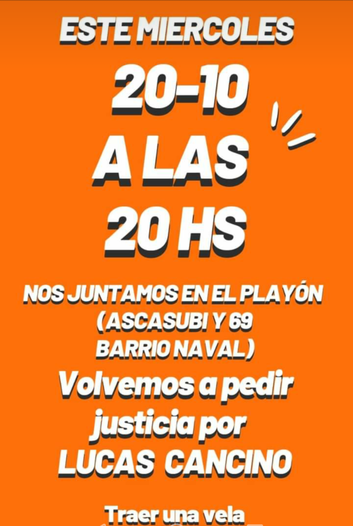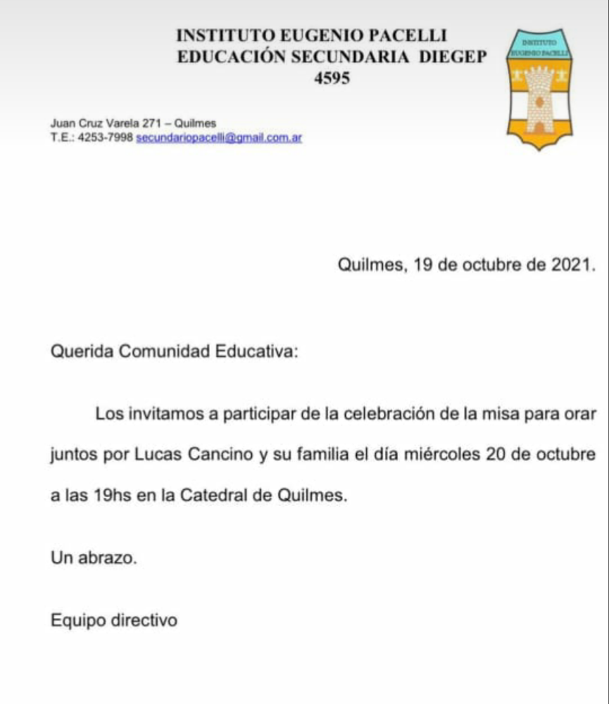 La comunidad del colegio parroquial al que asistía Lucas Cancino, joven asesinado en robo en el Barrio Naval de Ezpeleta, convoca a amigos y allegados a una misa en su nombre.