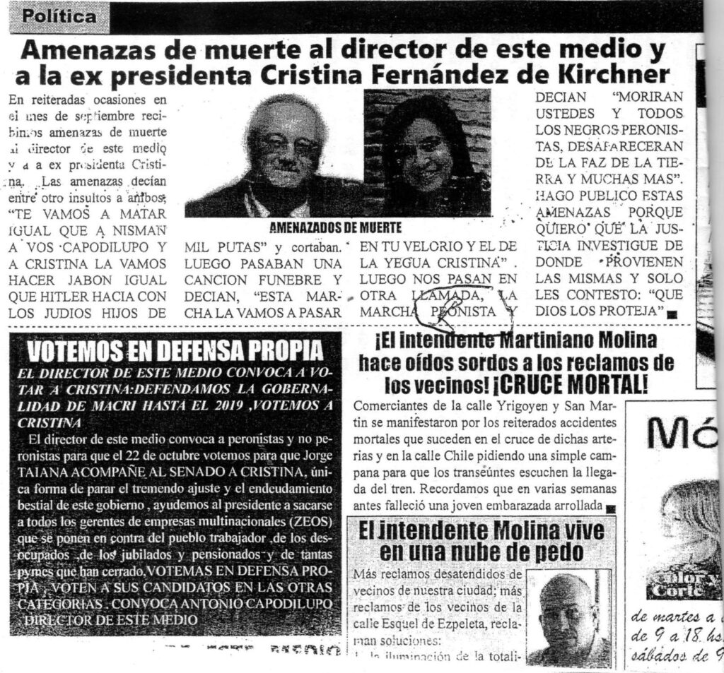 Gustaba de disputarle la palabra a poderosos como el diputado nacional (mc) Angel Abasto y otros. A Aníbal Fernández le puso una foto en tapa junto al título «Sería puto«, pero como una fina línea dividía la columna de portada, evitó perder el juicio.