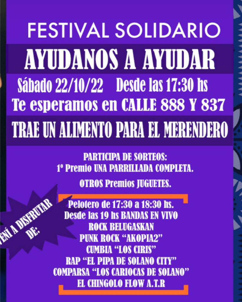 Este sábado desde las 17,30 divertite y ayudá donando alimentos para el merendero del barrio, Dos manitos al cielo, en un festival solidario que organizan los vecinos de 888 y 837, en Solano.