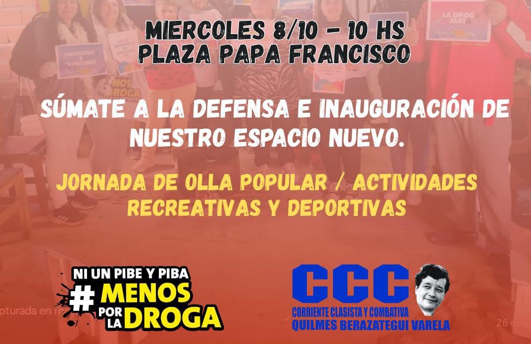 (Gacetilla) Desde el Movimiento Ni un Pibe Menos por la Droga y la Corriente Clasista y Combativa (CCC) invitamos a todos y todas los medios de comunicación, organizaciones sociales, vecinos y vecinas a participar de la Conferencia de Prensa y Jornada de Actividades Recreativas que realizaremos el miércoles 8 de octubre a las 10, en la Plaza Papa Francisco, Los Andes y Falucho, barrio Villa Itatí.
