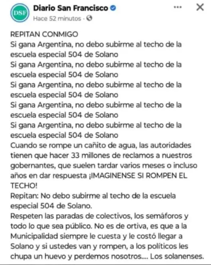 Se inició una campaña que advierte, y es increíble que tenga que hacerse esto, que si gana Argentina el domingo no se suban al techo de la Escuela 504, de Solano.
