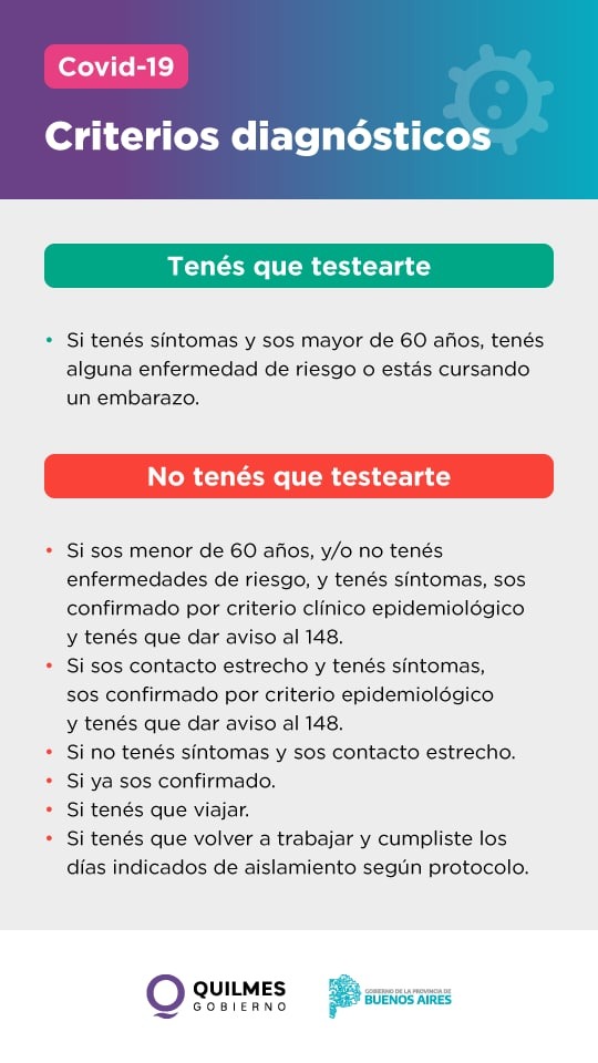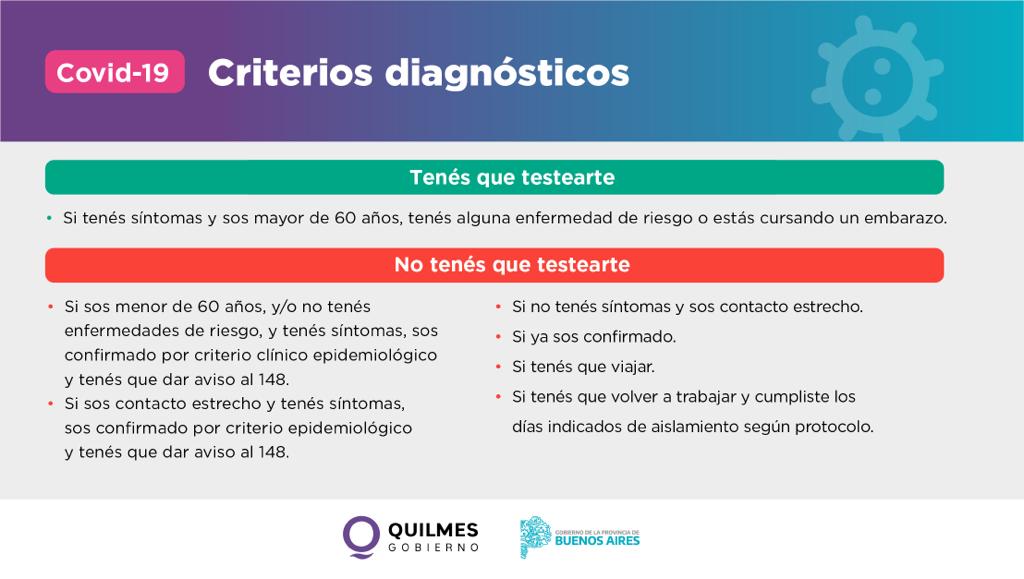 Se considera caso confirmado a quien reúna al menos un criterio epidemiológico (contacto estrecho de un caso confirmado en los últimos 10 días, haber participado de un evento en el que se hayan producido 3 o más casos o residir en zona de alta incidencia -como son todos los municipios del conurbano, incluyendo Quilmes-), y 2 o más de los siguientes síntomas: fiebre, tos, dolor de garganta, dolor de cabeza/dolor corporal, dificultad para respirar vómitos/diarrea, congestión nasal, falta de olfato/ gusto.