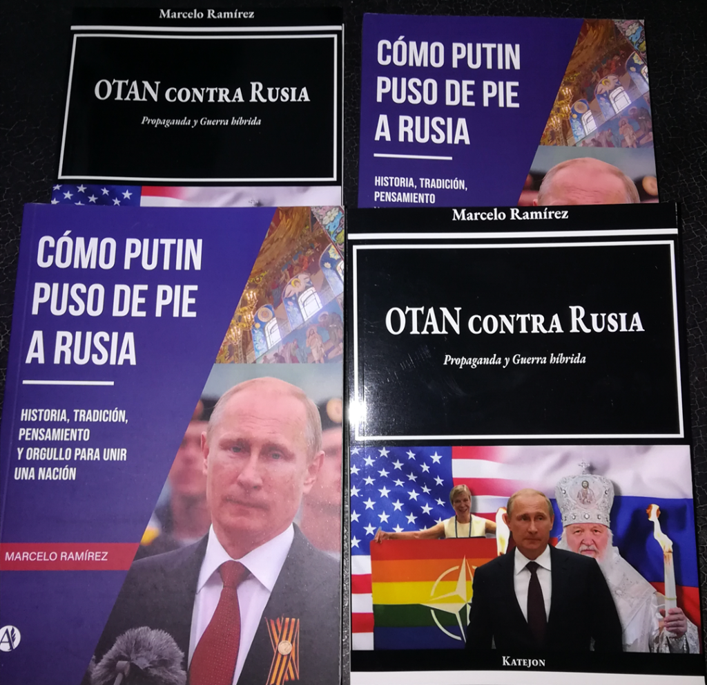 El escritor llevó también otro libro de su autoria, Cómo Putin puso de pie a Rusia.