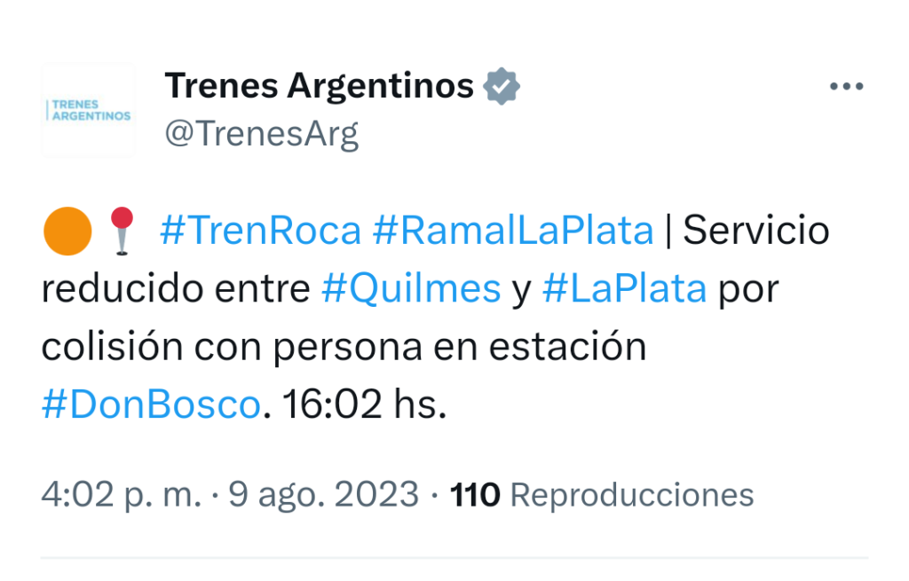 Don Bosco Seguridad OTRO ATROPELLADO EN LAS VIAS Ana Santillana 9 de agosto de 2023 No hay comentarios Imagen de archivo En la estación Don Bosco, otra vez a las 4 de esta tarde de miércoles.Acude el SAME y bomberos, el servicio se encuentra funcionando entre Quilmes-La Plata y viceversa.