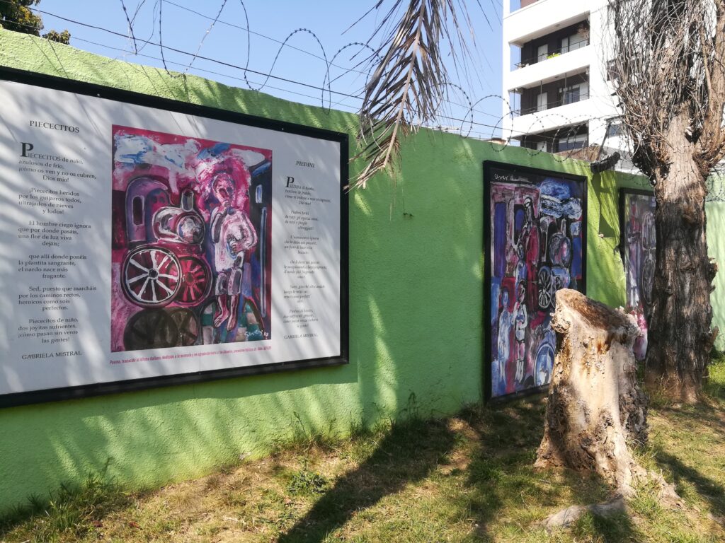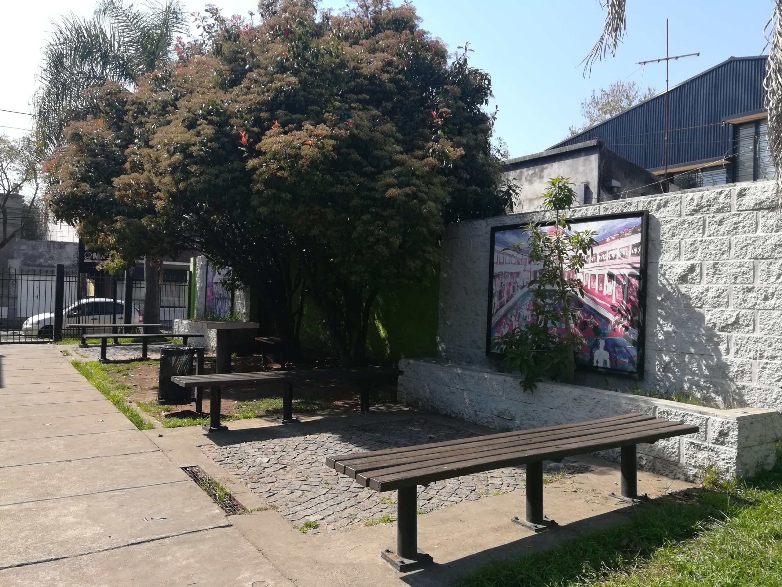 La explosión multicolor, y las cálidas figuras redondeadas de sus obras en reproducciones colgadas de los muros, se disfrutan desde bancos donde seguro que algún mate compartido dejó sus huellas.