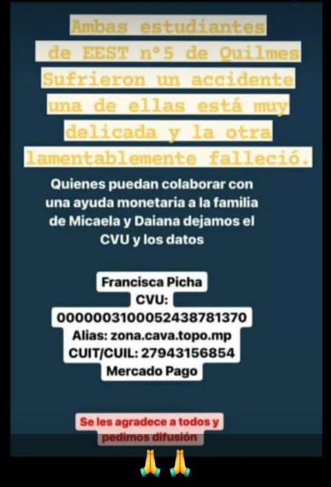 Dos hermanas y alumnas de la EEST 5 Reino de España, de la calle Garibaldi, sufrieron un accidente de auto el fin de semana de Pascuas. Una de ellas, de 5to año, falleció en el acto, junto a su primo, que conducía.