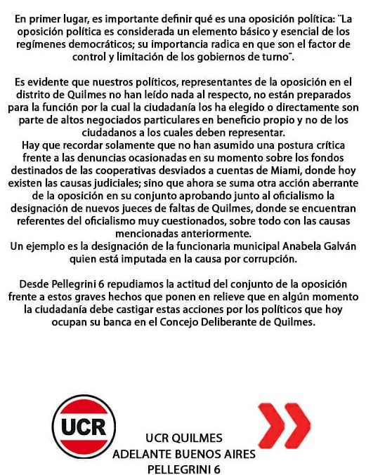 Por otra parte, un sector de la UCR emitió este comunicado crítico de la oposición:
