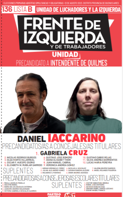 Hacia las PASO del 13 de agosto encabeza la lista 136 1A «Unidad de Luchadores y la Izquierda» Partido Obrero-MST, como primer precandidata a concejal; Lucas Pereyra, histórico referente del PO local, comparte la lista de precandidatos de la alianza que lleva a Gabriel Solano como postulante a presidente y Vilma Ripoll, vice.
