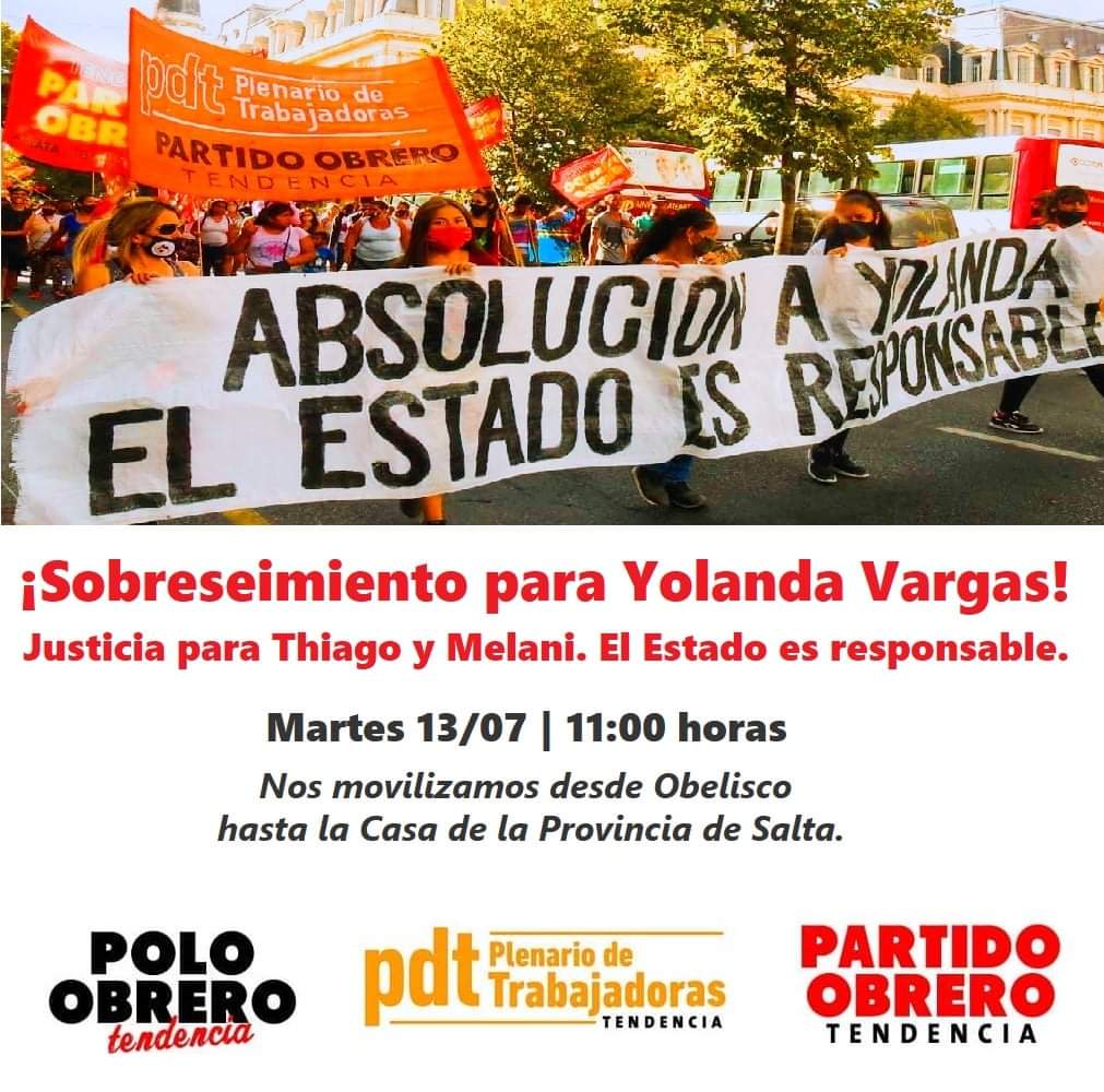 Hemos puesto en marcha una fuerte campaña por el sobreseimiento para Yolanda y Justicia para sus hijos. Este martes 13, a las 11am, en la Casa de Salta impulsamos una concentración y acto, donde presentaremos las más de 400 firmas conquistadas de organizaciones políticas, sociales, de derechos humanos, de mujeres de Argentina y de artistas e intelectuales de Colombia, Brasil, Turquía, Cuba y Chile.
