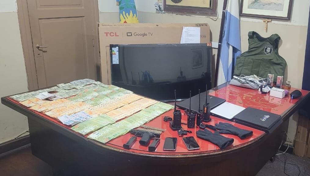 Incautaron un Peugeot 307 gris, utilizado en el robo, junto con su arma reglamentaria (una Bersa TPR9 con 34 proyectiles), un chaleco antibalas, uniforme y credencial policial. Les encontraron $852.000 y $1.801 dólares; joyas, dos notebooks, handys con cargadores, una plancha de pelo, zapatillas de marca y perfumes de alta gama. También un Gol Trend blanco, junto con un televisor TCL de 50 pulgadas, dos iPhones nuevos en sus cajas, una PlayStation Slim y $300.000.