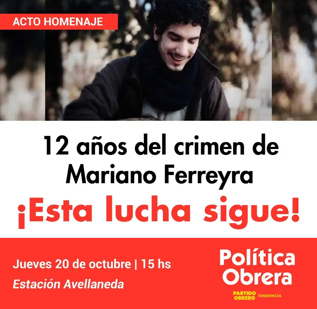 Este jueves 20 de Octubre, al cumplirse 12 años del asesinato de Mariano Ferreyra, habrá acto en Avellaneda.