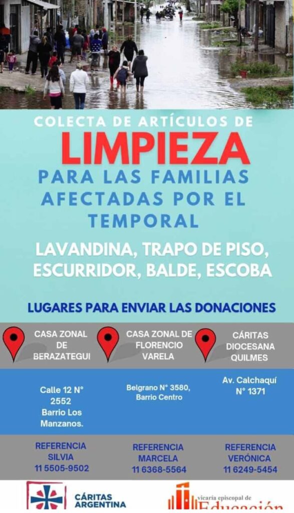 En esta instancia se requieren lavandina, trapos de piso, escurridores, baldes y escobas que se pueden acercar a la sede de Cáritas Quilmes y a las casas zonales de Berazategui y Varela en: