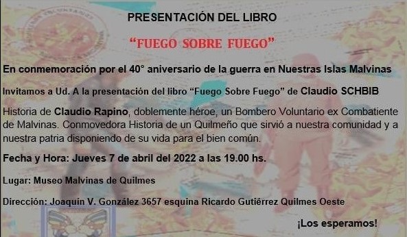 El jueves 7 de abril a las 19, en el Museo Malvinas, presentaré mi último libro Fuego Sobre Fuego, en conmemoración a los 40 años de la guerra en defensa de la soberanía de nuestras Islas Malvinas. La historia narra la vida de Claudio El Tano Rapino, un Bombero Voluntario que convocado a combatir en Malvinas, puso su vida a disposición de la comunidad y nuestra patria, un doble héroe que ningún quilmeño debe desconocer. ¡Los esperamos!