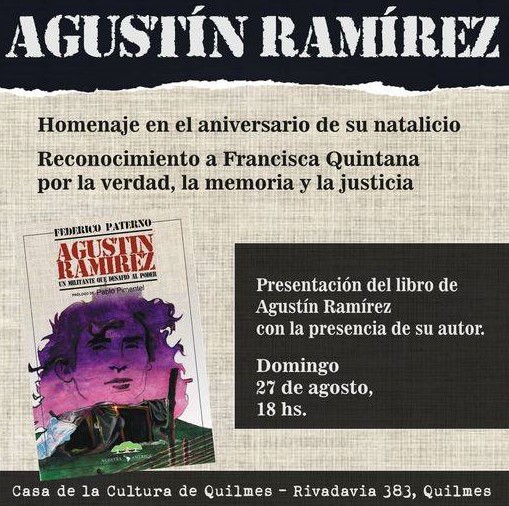 La Comisión de Amigos y Familiares de Agustín Ramírez consideró «Muy linda y emotiva jornada en la Casa de la Cultura de Quilmes», donde fue presentado el libro El militante que desafió al poder.