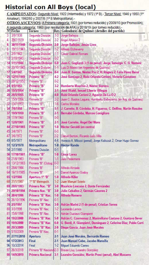 Larga historia tiene Quilmes con All Boys. Es el segundo rival más enfrentado luego de Tigre (106). Por su parte, Almagro también tiene la misma cantidad de partidos ante el Decano (101). Sin dudas, es un contrincante siempre duro de roer. De hecho, de los últimos 13 cotejos, el Cervecero solo se impuso en tres. Quilmes lleva tres partidos sin vencer a los porteños (un empate y dos derrotas). El último triunfo data del 3 a 1 el 14/9/19 en el Centenario.
