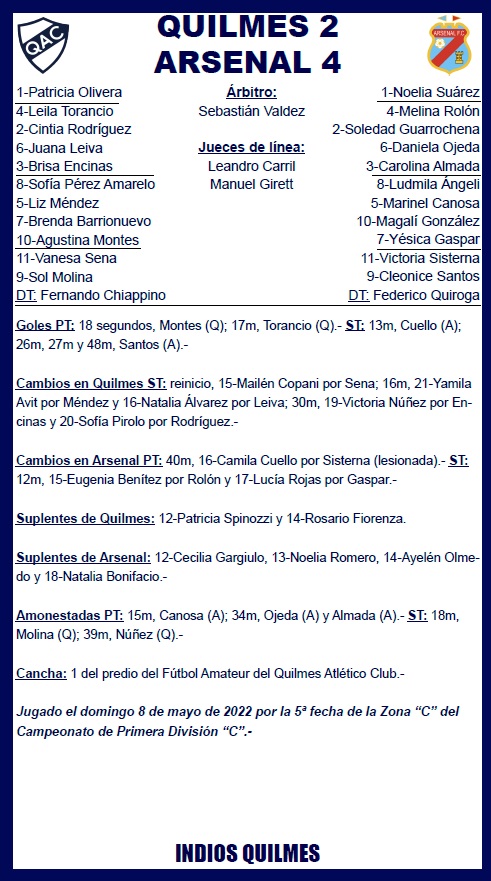 Quilmes cayó 4-2 frente a Arsenal en condición de local por la quinta fecha del Campeonato de Primera C. Las cerveceras empezaron se pusieron 2 a 0 goles de Agustina Montes y Leila Torancio, pero la visita lo dio vuelta con un tanto de Camila Cuello y un triplete de Cleo Santos.