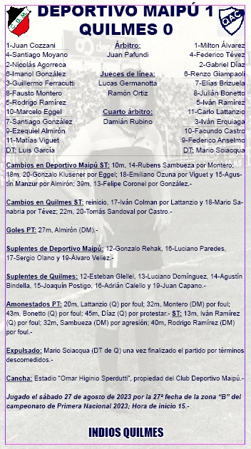 Quilmes, de a poco, empezó a meter a Maipú en su campo. Sin ser una maravilla, el elenco de Sciacqua tuvo incursiones en el área con claridad extrema. Anselmo tuvo un tiro desde afuera del área y una pifia en la definición que alarmaron a Maipú.