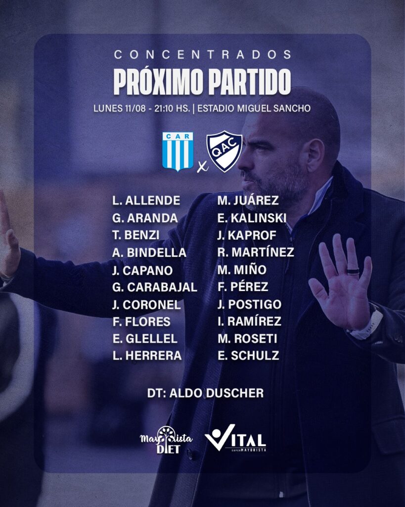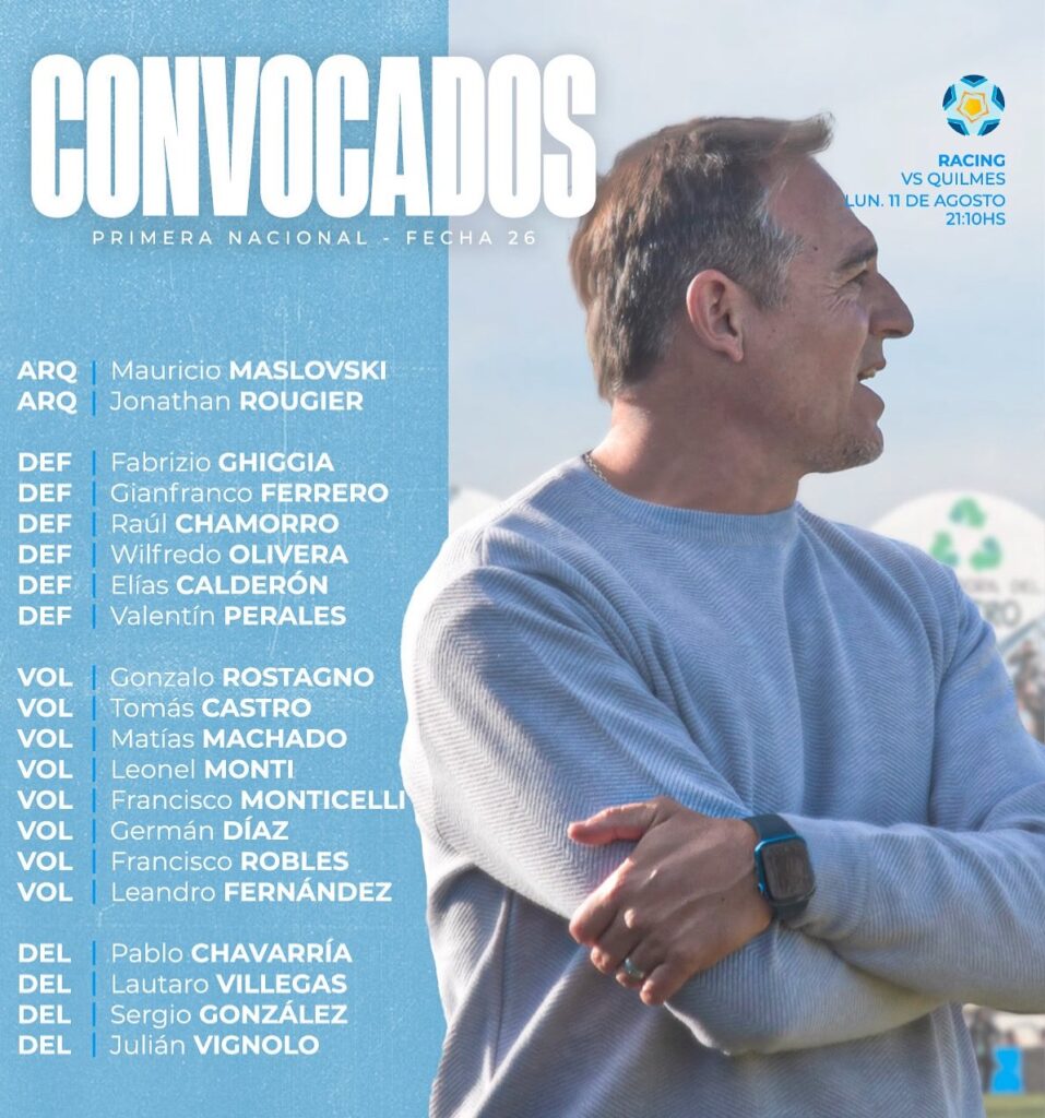 Racing cumple una campaña irregular, como Quilmes. Tiene los mismos puntos (30) pero viene de dos derrotas consecutivas. De hecho, de los últimos cuatro partidos, perdió tres. Según La Voz del Interior, el DT realizará dos cambios respecto del once inicial que cayó ante Los Andes en Lomas de Zamora por 2 a 0. Por un lado, entrarán Valentín por Albarracín y, por otro, Germán Díaz por Fernández.