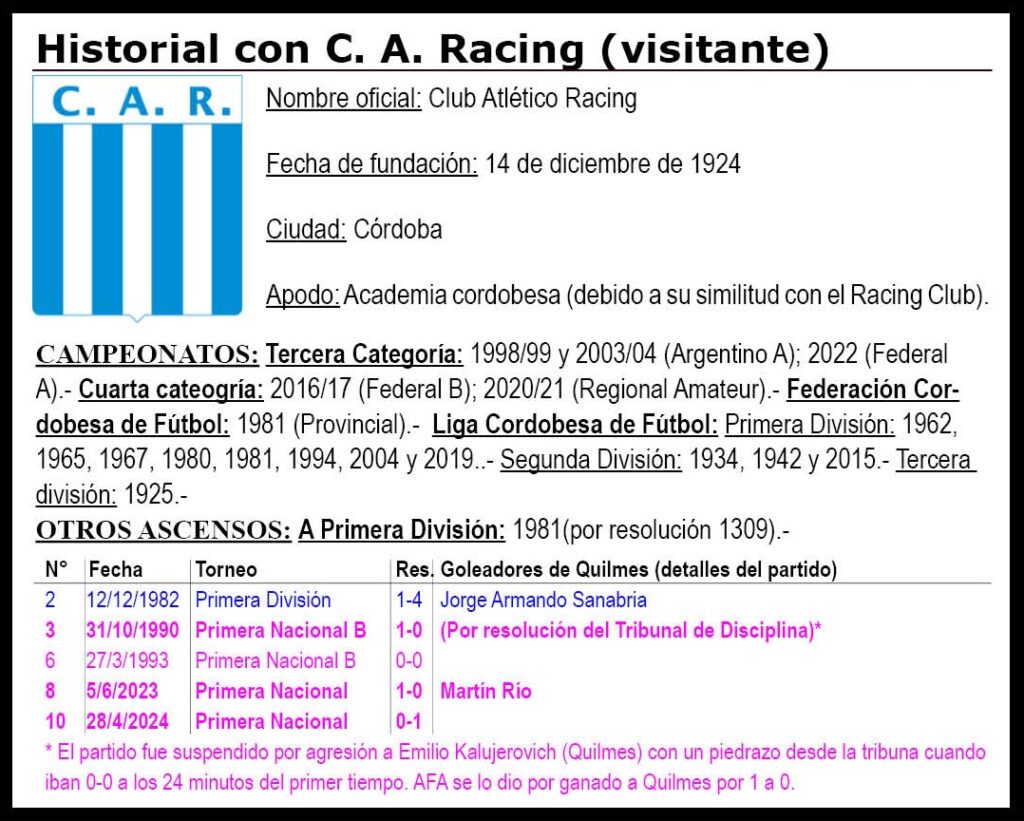 En Córdoba y como visitante, Quilmes jugó cinco veces. Ganó dos (e hizo tres goles), empató en una ocasión y cayó en las restantes dos (Racing marcó cinco tantos). Quilmes lleva un cotejo sin victoria (la caída mencionada de 2024). El último triunfo fue el 5 de junio de 2023 por 1 a 0 con gol de Martín Río. El duelo Racing vs. Quilmes se jugó cuatro veces en el estadio Miguel Sancho y una en la cancha de Instituto.