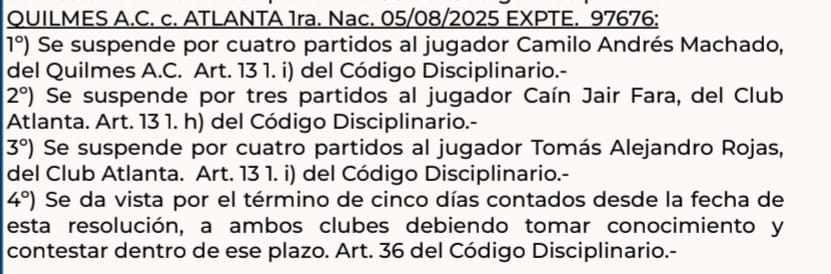 Tras la batahola final del triunfo frente a Atlanta, el Tribunal de Disciplina de la AFA se expidió y castigó duro a Camilo Machado: cuatro fechas para el colombiano por haberle pegado desde atrás a un rival cuando el partido estaba finalizado. Deberá purgar ante Racing, Los Andes, Alvarado y San Miguel.