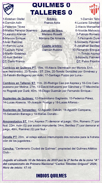 Quilmes empató sin goles ante Talleres en un cotejo donde se vio superado de forma táctica y estratégica a pesar de tener la mayor cantidad de tiempo el balón e intentar por varias vías encontrar el gol. Chocó casi siempre con el esquema planteado por el rival y no le encontró la vuelta a un equipo que se supo inferior pero no se sintió como tal.