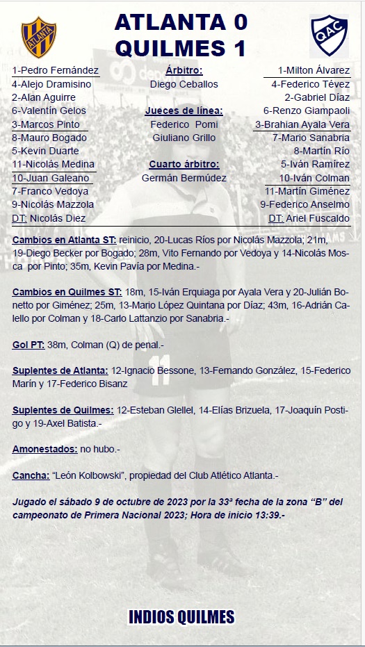 Mediodía de sol pleno en CABA y con Atlanta que jugó por nada, se vieron más rostros quilmeños que bohemios en la platea del León Kolbowski. El partido inició con mesura de parte de ambos, Quilmes esperó atrás para hacer gala de sus contraataques y Atlanta fue con aplomo a buscar. A los 6 minutos llegó el primer aviso del local desde la cabeza de Juan Galeano que estrelló el balón en el travesaño.