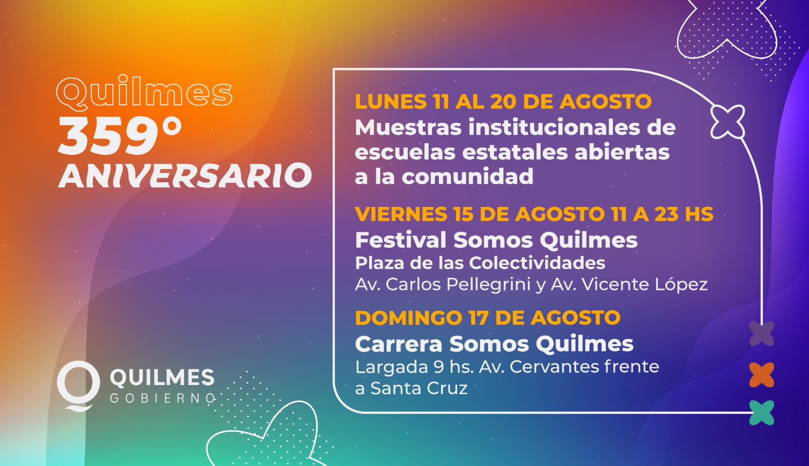 El Municipio informa que con motivo del 359º aniversario de la ciudad que se celebrará el jueves 14, llevarán a cabo diferentes propuestas recreativas, deportivas y culturales a lo largo de todo el mes, entre las que se encuentran shows artísticos y musicales en vivo en la plaza De las Colectividades, la Copa Ciudad de Quilmes y la Carrera Somos Quilmes, entre otras.