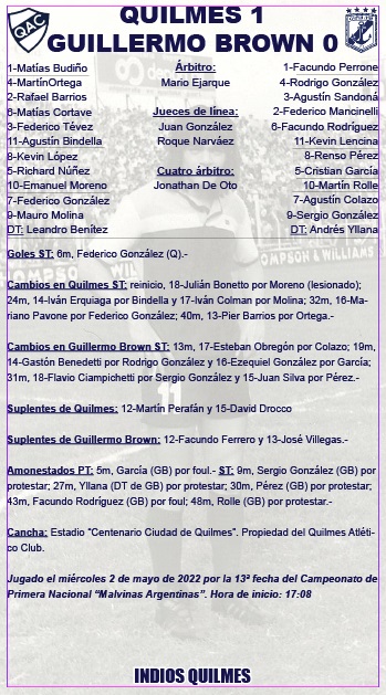 Quilmes venció 1 a 0 a Guillermo Brown y, de esta forma, cortó una racha de ocho partidos sin ganar por el campeonato. El gol fue marcado por Federico González a los seis minutos de la segunda etapa. El rendimiento del Cervecero fue de menor a mayor; y justificó el resultado por saber defender la ventaja, no como en otras ocasiones donde le empataron sobre el final. El referí, Mario Ejarque, obvió un penal para cada escuadra.