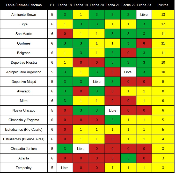 A pesar de la derrota ante Agropecuario Argentino en Carlos Carsares, Quilmes continúa como uno de los equipos de mejor actualidad en la zona «A» de la Primera Nacional. En las últimas seis jornadas, cosechó 11 puntos, dos menos que el de mejor rendimiento, Almirante Brown.