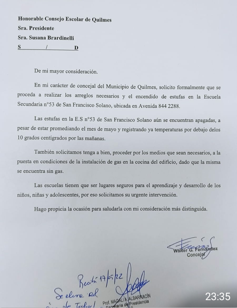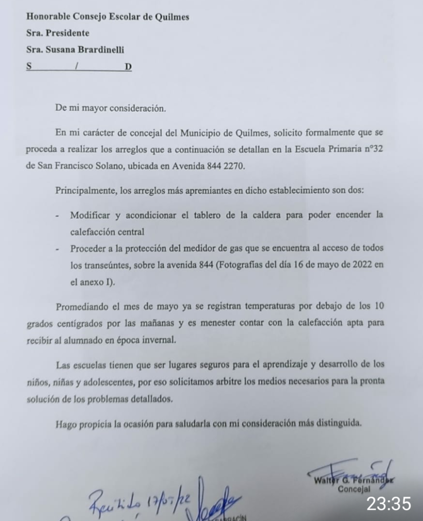Fernández también hizo una presentación con relación a la escuela primaria 32, solicitando que se modifique y acondicione el tablero de la caldera para poder encender la calefacción central y solicitó que intervengan el medidor de gas, dado que se encuentra sin protección en la vereda de la avenida, al acceso de cualquier transeúnte.