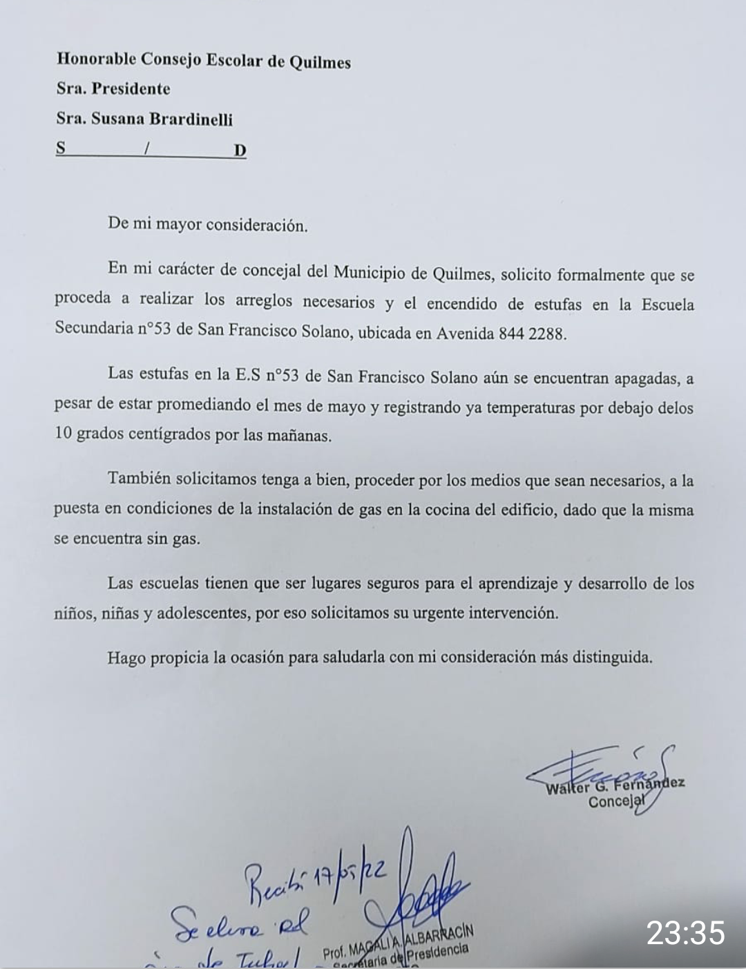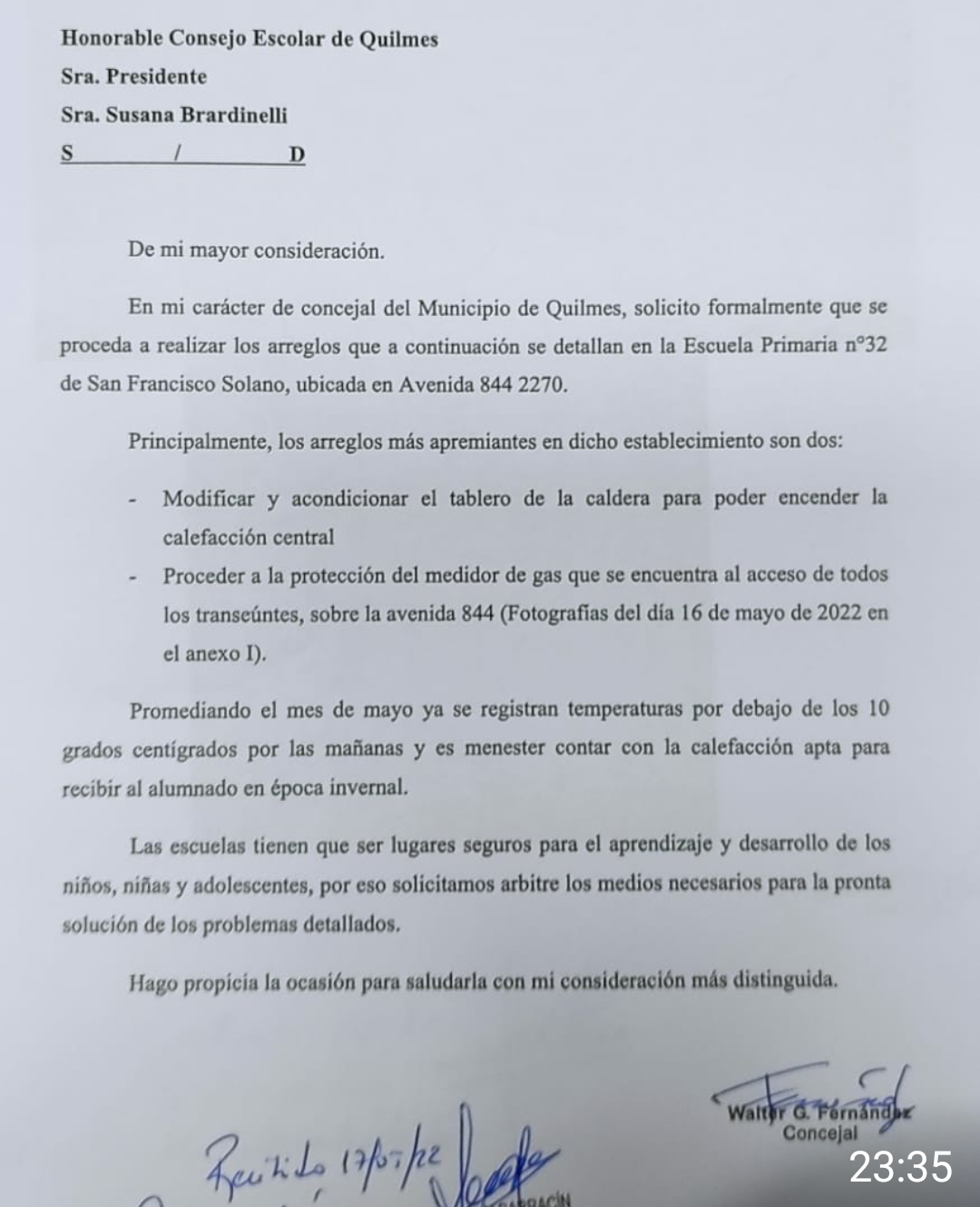 Fernández también hizo una presentación con relación a la escuela primaria 32, solicitando que se modifique y acondicione el tablero de la caldera para poder encender la calefacción central y solicitó que intervengan el medidor de gas, dado que se encuentra sin protección en la vereda de la avenida, al acceso de cualquier transeúnte.