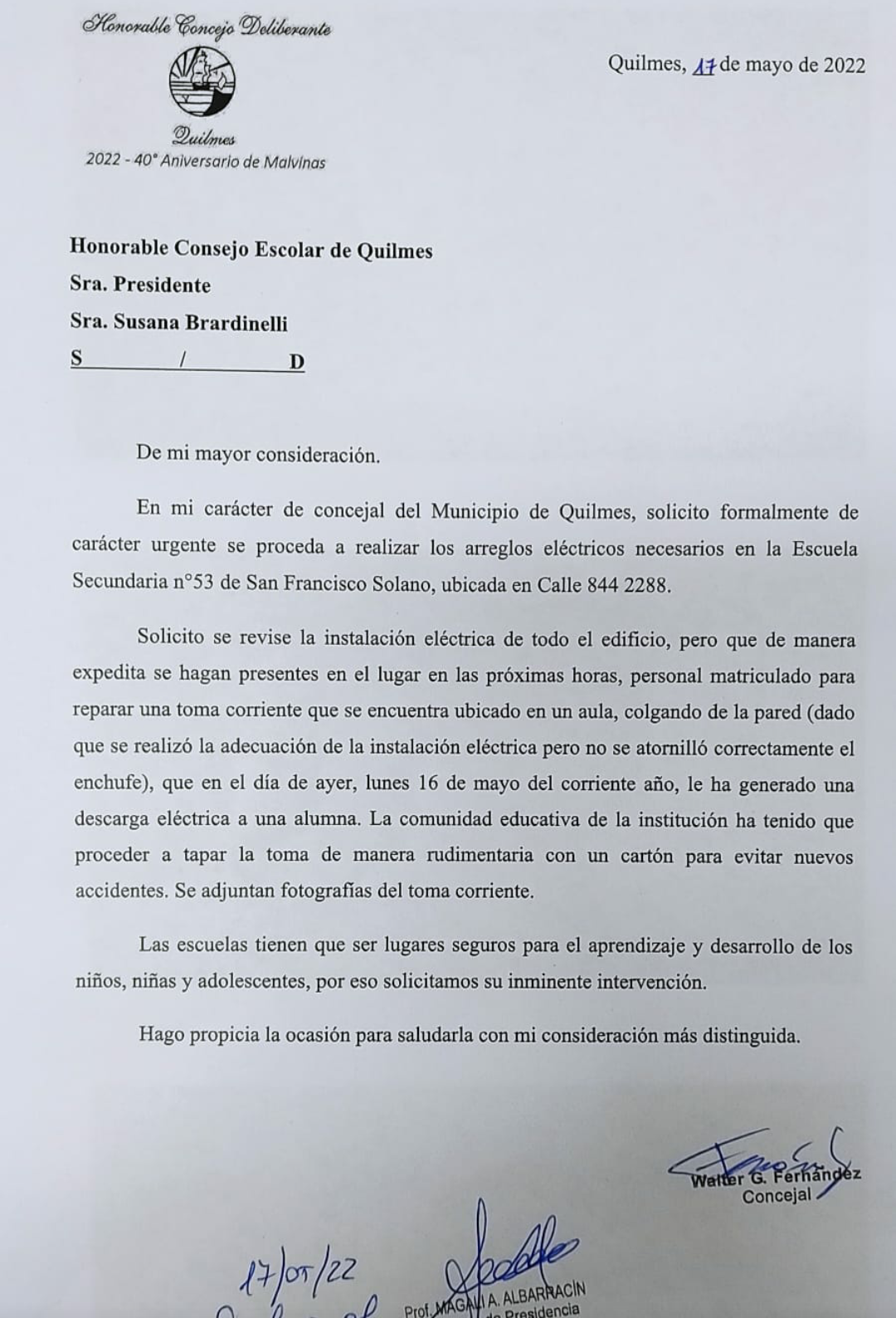 Walter Fernández, concejal de la Coalición Cívica-ARI (Juntos) presentó tres notas esta semana en el Consejo Escolar por problemas en las escuelas de Solano EP 32 y ES 53.