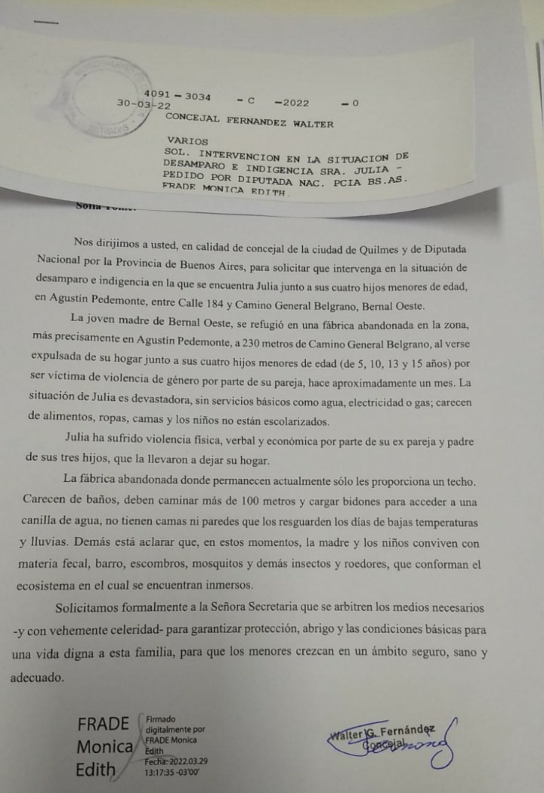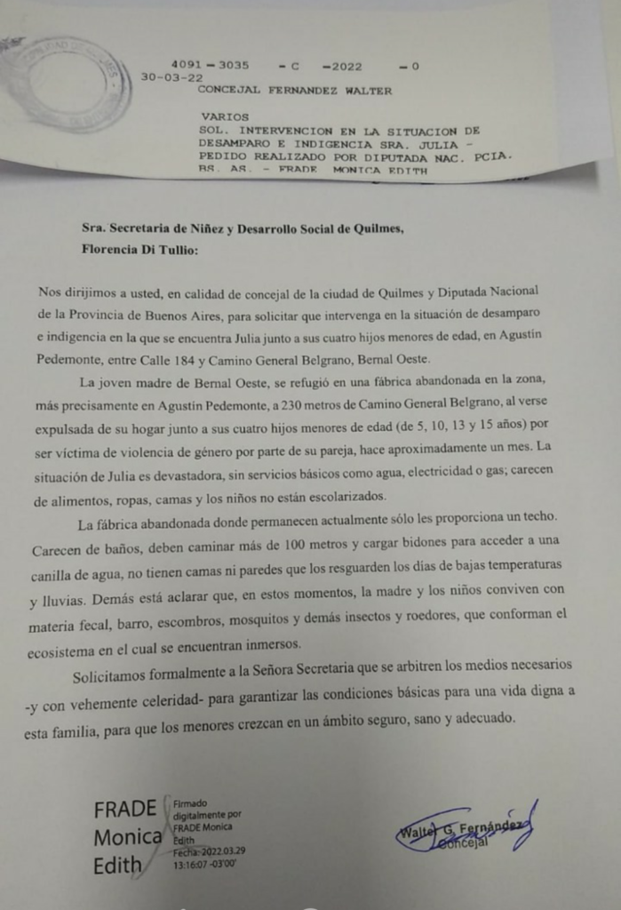 Esta mañana, el concejal Walter Fernández y la diputada nacional de Quilmes Mónica Frade solicitaron de manera formal a las Secretarías de Niñez y Desarrollo Social y a la de Mujeres y Diversidades, que intervengan con urgencia en el caso de Julia, la mamá refugiada junto a sus cuatro hijos menores, en una fábrica abandonada en Bernal Oeste, al huir de su hogar por violencia de género.