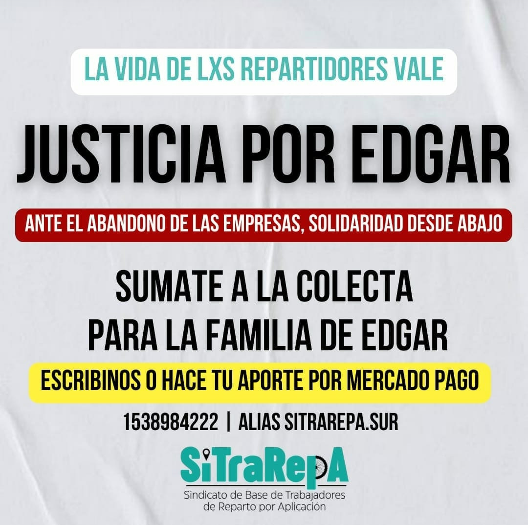 El Sindicato de Trabajadores de Reparto por Aplicación (SiTraRepA) publicó un comunicado en repudio a la muerte de un trabajador repartidor, por las malas condiciones laborales en que se encuentra el sector. Lamentan, además, que ningún directivo de la App se haya acercado a ofrecer ayuda a la familia.