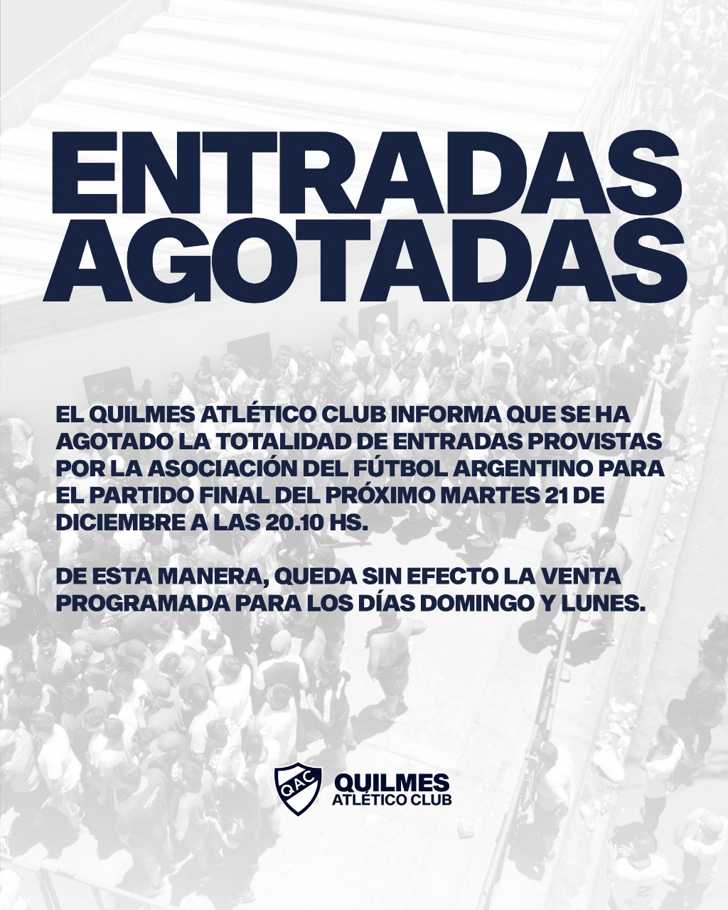 Hoy a las 17, dos horas antes de la finalización de la venta, se agotaron los boletos para la final del martes entre Quilmes y Barracas Central. Los tickets que tenía el Cervecero a disposición eran 15600 y se vendieron en poco más de cuatro horas y media. Ahora, la directiva encabezada por Christian Sterli negocia con AFA conseguir más localidades.