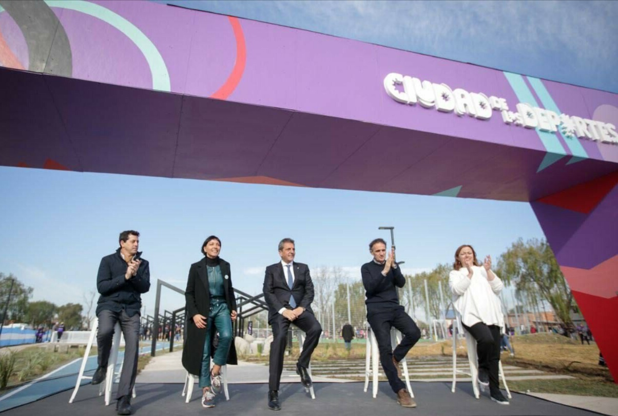 La intendente Mayra Mendoza, junto al actual ministro de Economía de la Nación y precandidato a Presidente de la Nación por Unión por la Patria, Sergio Massa, y al ministro del Interior y precandidato a Senador Nacional, Eduardo Wado de Pedro, el ministro de Obras Públicas, Gabriel Katopodis, y la presidenta de la Cámara de Diputados, Cecilia Moreau, participaron este martes de la inauguración de la Ciudad de los Deportes, en San Francisco Solano, acompañados de una multitud de vecinos que presenciaron este evento histórico para la localidad.
