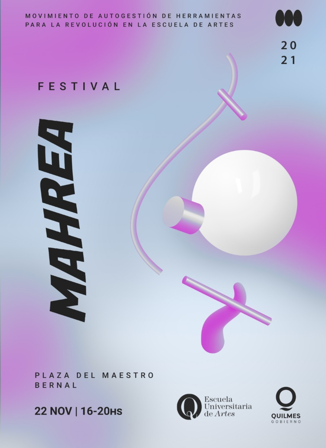 El Municipio informa que el lunes 22 se realizará el festival Movimiento de Autogestión de Herramientas para la Revolución en la Escuela de Artes (MAHREA), que tendrá lugar en la Plaza del Maestro (Deán Funes y Andrade, en Barrio Parque Bernal) de 16 a 20, organizado por las estudiantes de la Escuela Universitaria de Artes de la Universidad Nacional de Quilmes (UNQ).