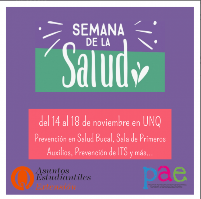 Desde el lunes 14 al viernes 18 de noviembre de 2022, de 9 a 20 horas, la Universidad Nacional de Quilmes (UNQ) será sede de la “12° Semana de la Salud”, organizada desde el espacio de Salud del Programa Institucional de Asuntos Estudiantiles de la Secretaría de Extensión Universitaria.
