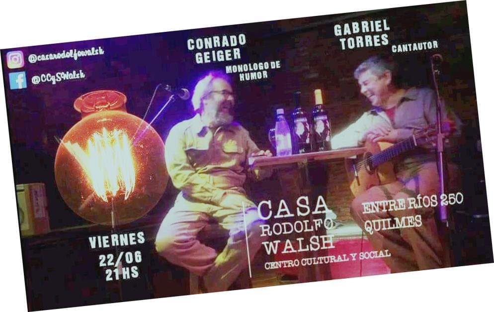 Este sábado desde las 21 vendrá Conrado Geiger a participar junto al crédito local Gabriel Torres, músico popular que, a sus canciones de amor político suma el monólogo de humor político de Geiger, tal como preanuncia su invitación.