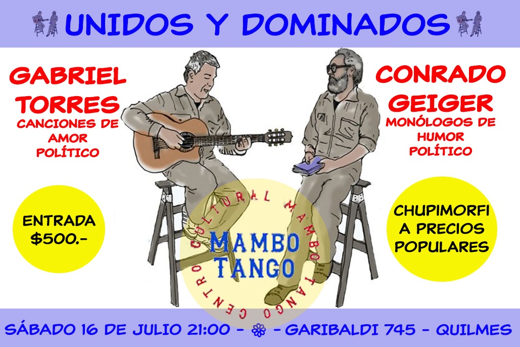 Este sábado desde las 21 vendrá Conrado Geiger a participar junto al crédito local Gabriel Torres, músico popular que, a sus canciones de amor político suma el monólogo de humor político de Geiger, tal como preanuncia su invitación.