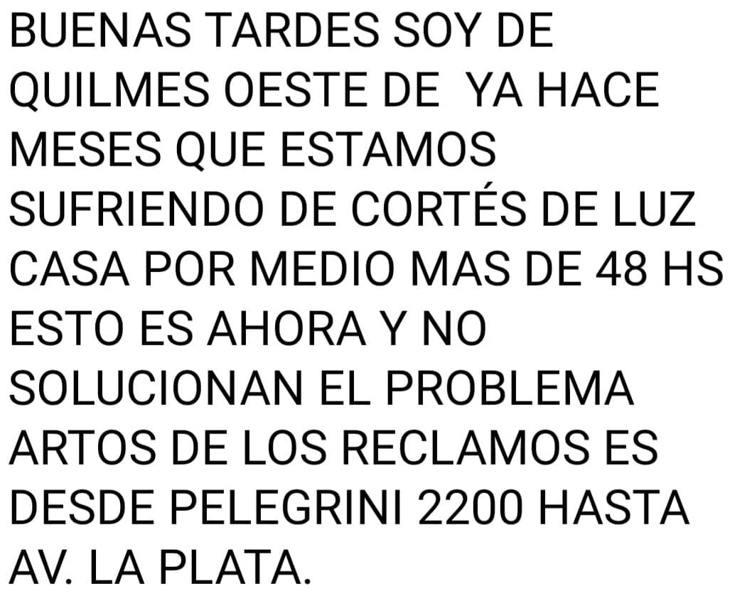 Lectoras de este CIQ han compartido su fastidio por la falta de suministro eléctrico en una amplia zona de Quilmes Oeste.