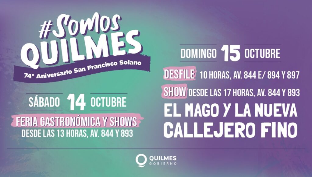 El Municipio invita a las vecinas y vecinos a celebrar el 74º aniversario de San Francisco Solano, que el sábado 14, desde las 13, contará feria gastronómica y shows; mientras que el domingo 15, a partir de las 10, tendrá el desfile cívico tradicionalista; la feria gastronómica y de emprendedores locales, y a las 17, se llevará adelante una nueva edición del festival Somos Quilmes, con entrada libre y gratuita, con música en vivo y que tendrá un final a pura cumbia con El Mago y La Nueva, el cierre estelar con el RKT de Callejero Fino.