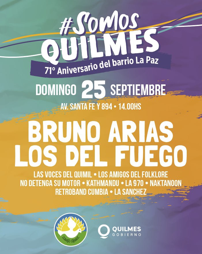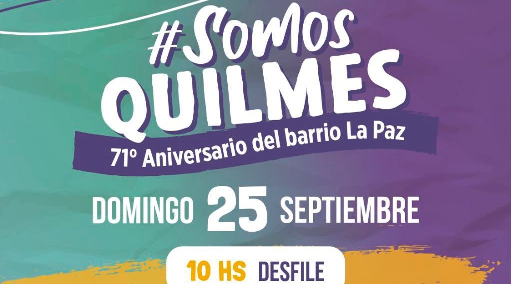 El Municipio invita a participar de las actividades del domingo 25 de septiembre por el 71° aniversario del barrio La Paz, en Quilmes Oeste. Las propuestas iniciarán a las 10, con un desfile sobre la avenida Eva Perón y calle 807; proseguirá a las 11, con una feria de emprendedores en las avenidas Eva Perón y Santa Fe, y continuará a las 14, con una nueva edición del festival Somos Quilmes, en Santa Fe y calle 894.