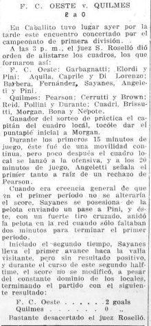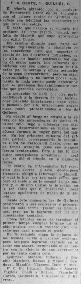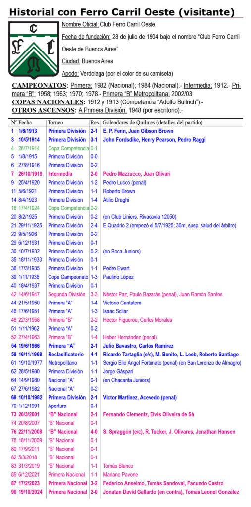 Quilmes jugará ante Ferro Carril Oeste por vez número 91. Se enfrentan desde 1913, temporada en que los porteños fueron ascendidos por decreto para cubrir plazas faltantes en la Asociación Argentina de Football en la división superior debido a la emigración de 1912 por varios equipos hacia la Federación Argentina de Football.